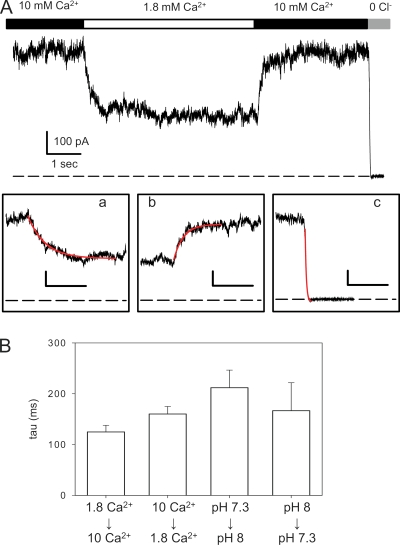 Figure 3. Relaxation kinetics upon fast concentration jumps in outside-out patches. (A) Example recording of a patch held at 60 mV in which [Ca2+]ext was switched from 10 to 1.8 mM, and then back to 10 mM. Finally, the patch was exposed to a solution without Cl− (and without Ca2+). The three insets below show the transition regions on an expanded time scale (bar, 500 ms), superimposed with a single-exponential fit (red line). Time constants for the solution exchange (inset c) were on the order of 10 ms. (B) Average time constants (n > 3 patches) for the indicated transitions.
