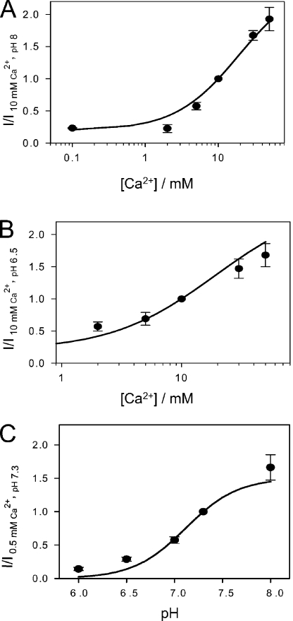 Figure 4. Ca2+ and pH effects on ClC-Ka at mixed conditions. (A and B) Effect of [Ca2+]ext on ClC-Ka measured at pHext 8 (A, n = 6) and pHext 6.5 (B, n = 4). Currents at 60 mV were normalized to values measured in 10 mM [Ca2+]ext and plotted versus [Ca2+]ext. (C) Effect of pHext on ClC-Ka in 0.5 mM Ca2+ (n = 3). Currents at 60 mV were normalized to values measured at pH 7.3 and plotted versus pHext. Lines represent the theoretical predictions obtained using Eqs. 1 and 2 as described in Results using the same parameters obtained from the fit in the standard conditions (i.e., pK = 7.11; KC = 19.6 mM, KO = 1.5 mM, and r0 = 434).