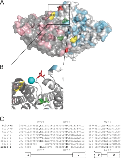 Figure 5. Location of mutants mapped on the structure of ecClC-1. (A) A surface representation of the bacterial ecClC-1 (Protein Databank accession no. 1OTS) viewed from the extracellular side is shown. The two subunits that compose ecClC-1 are colored in gray and light gray, respectively. The residues corresponding to those selected for mutation are shown in pink and light blue in the two different subunits, respectively. The transparent surface also allows a glimpse of the internal mutated residues. The residues responsible for Ca2+ and H+ sensitivity are shown in different colors: yellow, E261 (corresponding to E235 of ecClC-1); red, D278 (corresponding to N250 of ecClC-1); green, H497 (corresponding to L421 of ecClC-1); the numbers of residues indicated in the figure correspond to those of ClC-Ka. (B) A zoom of a selected region is shown in cartoon representation. The three residues E235, N250, and L421 are highlighted as sticks and colored as in A. A hypothetical Ca2+ ion is shown as a light blue sphere between E261 and D278. (C) Alignments around the three residues responsible for Ca2+ and proton sensitivity are shown. E261, D278, H497, and the corresponding residues in other CLCs are in bold.