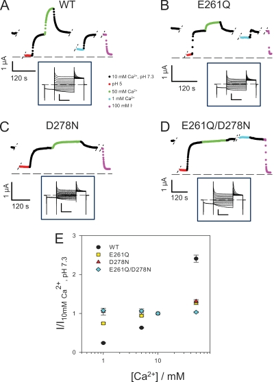 Figure 6. Effect of [Ca2+]ext on ClC-Ka WT and its mutants E261Q, D278N, and E261Q/D278N. (A–D) The mean current, shown in color, at 60 mV plotted as a function of time. The type of solution applied is color coded as indicated in the middle inset. Breaks during the experiment are indicated with short dashed lines. Insets display representative current traces evoked by the standard IV-pulse protocol in standard solution. Horizontal bars, 100 ms; vertical bars, 3 µA. (E) Dose–response relationship of the modulation by Ca2+ of ClC-Ka WT (black circles; n = 16) and the mutants E261Q (yellow squares; n = 4), D278N (red triangles; n = 5), and E261Q/D278N (light blue rhombi; n = 5). Currents at 60 mV were normalized to values measured in standard solution and plotted versus [Ca2+]ext. Data for WT are different compared with Fig. 1 because they were obtained from different oocytes as control measurements in the mutagenic screen. The currents shown for the mutants D278N and E261Q/D278N are from oocytes with exceptionally large expression. On average, the current expression level measured at 60 mV were (in µA ± SD [no. of oocytes]): WT (2 d), 2.5 ± 1.4 (7); WT (3 d), 5.3 ± 1.9 (8); E261Q (1–2 d), 4.3 ± 0.9 (4); D278N (>3 d), 1.1 ± 0.9 (8); E261Q/D278N (>3 d), 2.2 ± 0.9 (7); E261Q/D278N/H497M (>3 d), 0.8 ± 0.3 (15); not injected, 0.17 ± 0.07 (8).