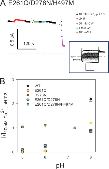 Figure 7. Effect of [H+]ext on ClC-Ka WT and its mutants E261Q, D278N, E261Q/D278N, and E261Q/D278N/H497M. (A) The current at 60 mV, shown in color, of the triple mutant E261Q/D278N/H497M as a function of time (color code as in Fig. 6). Inset in A shows representative current traces of the mutant in standard solution. Horizontal bars, 100 ms; vertical bars, 1 µA. Capacitive transients have been blanked for clarity. (B) Dose–response relationship of the modulation by protons of ClC-Ka WT (black circles; n = 14) and the mutants E261Q (yellow squares; n = 4), D278N (red triangles; n = 5), E261Q/D278N (light blue rhombi; n = 5), and E261Q/D278N/E261Q (green hexagons; n = 5). Currents at 60 mV were normalized to values measured in standard solution and plotted versus pH. Data for WT are different compared with Fig. 2 because they were obtained from different oocytes as control measurements in the mutagenic screen.