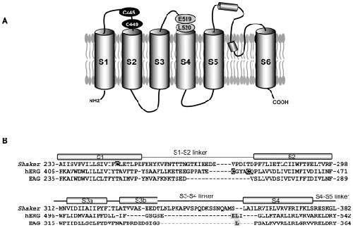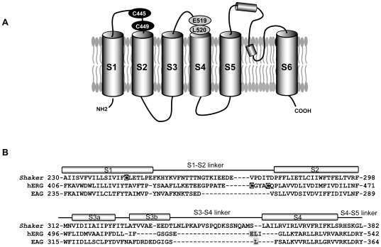 Figure 1. Topology of the hERG channel and location of endogenous cysteine residues.(A) Proposed membrane topology of the hERG channel showing relative positions of endogenous cysteine residues in S1–S2 linker (C445 and C449), and location of introduced cysteines (E519, L520C). (B) Alignment of primary sequences of amino acids of hERG, Shaker and EAG, in the S1–S2 and the S3–S4 regions. The exact positions of the helices and linkers are from [44]. The endogenous cysteine residue removed in Shaker fluorimetry studies (C245) and the accessible cysteine residues in the hERG channel are in white font on dark background. Black letters in gray background indicate sites of introduced cysteine residues and TMRM binding in the hERG (this study) and EAG channels [5].