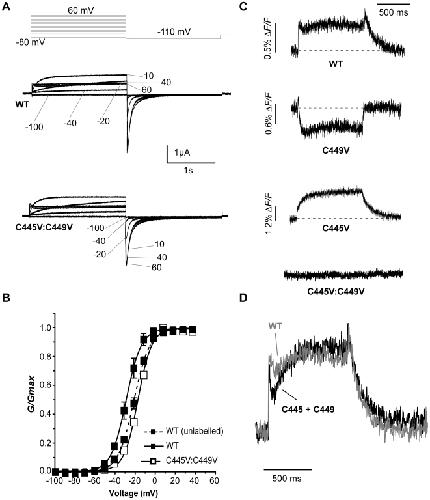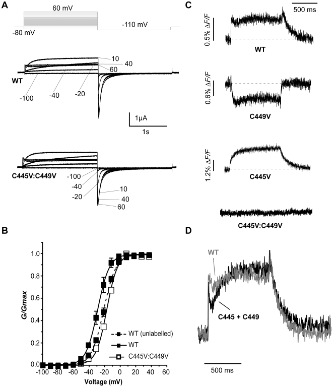 Figure 2. Endogenous cysteine residues are accessible to TMRM labelling.(A) Representative hERG currents (WT and C445V:C449V) evoked by 2 s depolarizing steps from −80 to potentials ranging from −100 to 60 mV. Membrane was then hyperpolarized at −110 mV for 2 s. (B) Comparison of WT and C445V:C449V G-V curves with (solid line) and without (dotted line) TMRM labelling, obtained by plotting the maximum tail current against voltage (WT unlabelled V½ = −19.7±1.2 mV and k = 8.1±0.2, n = 5; WT labelled V½ = −27.5±2.0 mV and k = 7.7±0.7, n = 3; C445V:C449V V½ = −15.7±0.7 mV and k = 7.1±0.3, n = 6). (C) Representative TMRM fluorescence traces recorded during 1 s depolarizations from −80 to +40 mV and then repolarized to −110 mV from: WT channels, channels with one cysteine (C449V, C445V), and channels with both cysteines removed (C445V:C449V). Note that C445V:C449V channels no longer fluoresce. (D) Arithmetic addition of fluorescence reports from C445V and C449V (black) compared to the WT signal (gray).