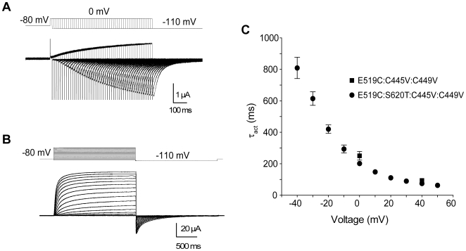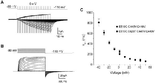 Figure 4. Time course of activation is slow in hERG channels.(A) Representative current traces recorded using an envelope of tails protocol, obtained from the E519C:C445V:C449V mutant. Membrane potential was stepped to 0 mV from −80 mV for varying durations of time and repolarized to −110 mV. The downward pulses are capacitive currents for each pulse. (B) Representative current traces from the E519C:S620T:C445V:C449V channels, using the same two-pulse protocol as in Fig. 2A. (C) Plot of time constants of activation against voltage. Squares represent τact from E519C:C445V:C449V for two voltages (0 and +40 mV), obtained by plotting the peak tails versus test pulse duration (n = 8 for each voltage), then fitting using a single exponential. Circles represent τact from E519C:S620T:C445V:C449V, obtained by fitting the current activation phase with a single exponential (n = 8).