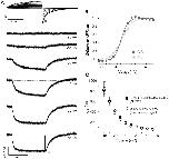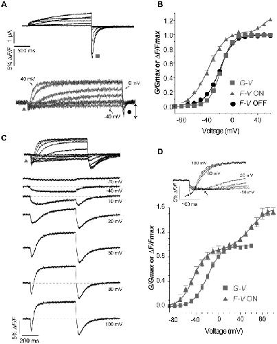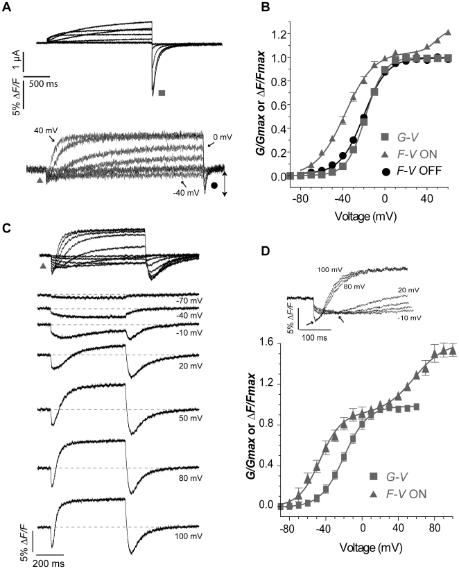 Figure 5. Relationship between E519C:C445V:C449V fluorescence signal and ionic conductance.(A) Representative current (above) and fluorescence traces (below) recorded using the same protocol as in Fig. 2A. (B) Comparison of G-V curve (squares, V½ = −18.3±1.2, k = 8.8±0.2 mV, n = 7) with fluorescence-voltage relationship from the tail of fluorescence (circles, F-VOFF; V½ = −20.6±1.2 mV, k = 11.4±0.6 mV, n = 16), measured at the times indicated by the symbols in panel A, and with fluorescence-voltage relationship from the peak fluorescence quenching upon depolarization (F-VON, triangles in panel A). The F-VON curve was obtained by plotting the maximum amplitude of the downward deflection for each trace, and normalized to +20 mV (estimated saturation voltage), and was best fit with a double Boltzmann function, as a second component appears at positive potentials (first phase: V½,1 = −37.8±1.7 mV, k1 = 13.7±0.7 mV; F-VON second phase: V½,2 = 43.5±7.9, k2 = 9.6±2.6 mV, n = 13; A1 = 0.96±0.2). (C) Representative fluorescence traces obtained during 500 ms depolarizing steps from −80 to potentials ranging from −90 to 100 mV. Membrane was then hyperpolarized at −110 mV for 500 ms. (D) Normalized G-V relationship (squares, V½ = −19.6±2.0, k = 13.8±2.7 mV, n = 3) obtained as in A compared to F-VON (first phase: V½,1 = −46.7±2.1 mV, k1 = 12.7±1.1 mV; F-VON second phase: V½,2 = 56.7±7.2, k2 = 16.9±3.9 mV, n = 3; A1 = 0.56±0.05). The inset shows the fluorescence signal from a representative cell, to highlight the first saturation step at about 0 mV and the second saturation step at about 80 mV.