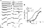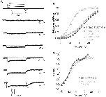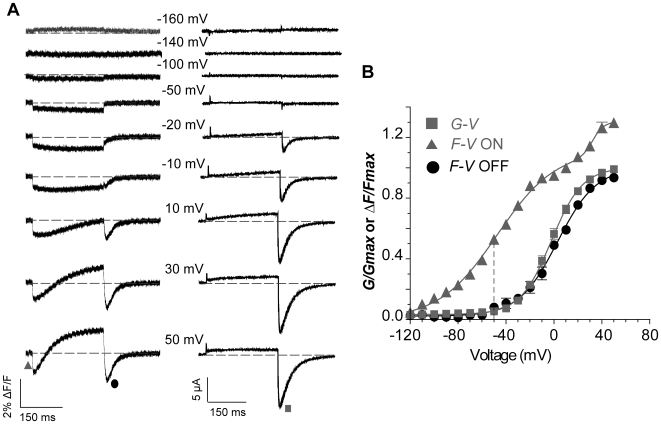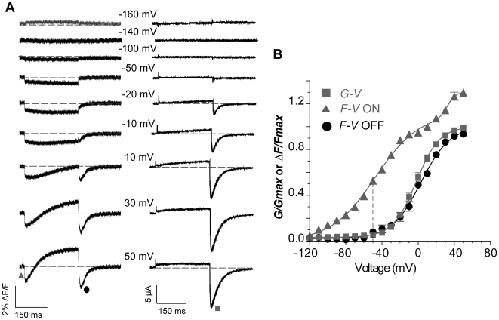 Figure 6. Detection of S4 movement from E519C labelling at potentials negative to channel activation.(A) Representative fluorescence and current traces recorded during 300 ms pulses from a holding potential of −140 mV to potentials ranging from −160 to 50 mV. (B) Comparison of G-V curve (squares, measured from ionic tail currents in A; V½ = −2.2±2.2 mV, k = 12.8±0.2 mV, n = 3) with fluorescence-voltage relationship from the initial quenching (triangles) measured as in Fig. 5B. F-VON curve was best fit with a double Boltzmann function, with F-VON first phase V½,1 = −48.5±2.4 mV, k1 = 23.8±0.1 mV, and F-VON second phase V½,2 = 30.0±5.2 mV, k2 = 4.2±1.4 mV, n = 3 (A1 = 0.83±0.01). Note that between −120 and −50 mV no ionic current was observed, but a fluorescence deflection could be observed positive to −110 mV. The F-VOFF is also shown (circles in panel A, V½ = 2.5±1.8 mV, k = 16.2±2.3 mV, n = 3).