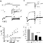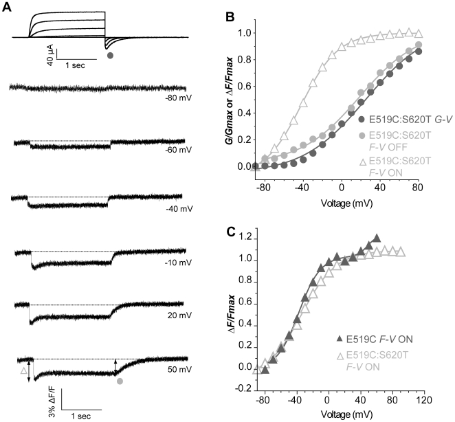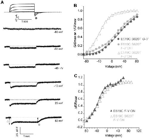 Figure 7. Conservation of the first component of the initial fluorescence quenching in the S620T, inactivation-removed mutant.(A) Representative traces of current and fluorescence from E519C:S620T:C445V:C449V mutant. The protocol used is the same as in Fig. 2A, but depolarization steps were applied from −100 to +120 mV (B) G-V and F-V relationships obtained for the representative cell in A. G-V: V½ = 24.9, k = 32.9 mV; F-VON: V½ = −42.1, k = 19.3 mV; F-VOFF: V½ = 18.4, k = 30.4 mV. (C) Comparison of mean data for the F-VON of E519C:S620T:C445V:C449V (open triangles), V½ = −34.4±1.5, k = 22.2±1.4 mV (n = 10) with F-VON of E519C:C445V:C449V (closed triangles) from Fig. 5B.