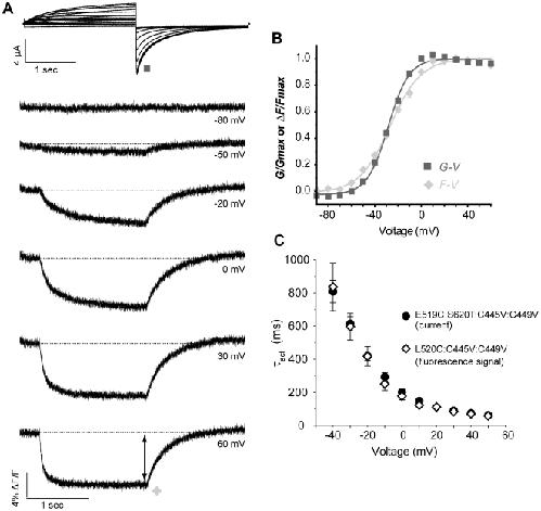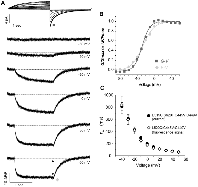 Figure 8. Relationship between L520C:C445V:C449V fluorescence signal and ionic conductance.(A) Representative current and fluorescence traces recorded using the same protocol as in Fig. 2A. (B) The F-V relationship was obtained by plotting the amplitude of fluorescence at the end of the depolarization pulse against voltage (diamonds; V½ = −26.8±1.0 mV, k = 13.3±0.6 mV (n = 10)), and is compared to mean data for G-V (squares; V½ = −28.4±0.7 mV, k = 9.0±0.2 mV (n = 6)). (C) Comparison of time course of activation of E519C:S620T:C445V:C449V channels (circles, from Fig. 4C) with the time course of fluorescence deflection from L520C:C445V:C449V mutant (diamonds, n = 6). The fluorescence signal upon depolarization was fitted with a single exponential and plotted against voltage.