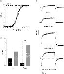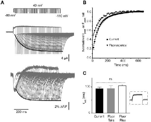 Figure 9. Analysis of activation time course of E519C:C445V:C449V channels and correlation with fluorescence signal.(A) Representative current and fluorescence traces, showing time course of activation measured using an envelope of tails protocol. Membrane potential was stepped from −80 to +40 mV for increasing time periods (15 to 675 ms, with 15 ms intervals), then repolarized to −110 mV. (B) The peak tail current (circles) and fluorescence (triangles) tails, obtained after repolarization from +40, were normalized and plotted against the pulse duration. (C) Time constants of activation of current (black bar) and fluorescence (gray bar), obtained from an exponential fit to the peak tails (represented by black lines in Fig. 8A). The white bar represents the exponential fit of the fluorescence deflection upon depolarization for 2 s to +40 from −80 mV (shown in inset). No significant differences were observed between groups.