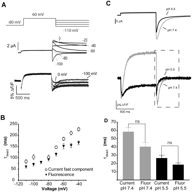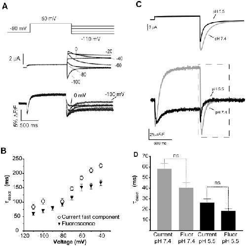 Figure 10. E519C:C445V:C449V tail fluorescence reports on deactivation.(A) Current and corresponding fluorescence reports evoked by a 1 s depolarization to +60 mV from a holding potential of −80 mV, followed by repolarization to potentials ranging from 0 to −110 mV for 2 s. (B) Plot of mean time constants of fluorescence decay fit with a single exponential and the fast time constant of a double exponential fit of current deactivation. (C) Currents (above) and fluorescence (below) evoked by a single pulse to +40 mV from −80 mV at pH 7.4 and 5.5. (D) Comparison of the average time constants obtained using a single exponential fit to the decay of current and fluorescence at pH 7.4 and 5.5. No significant differences were found between time constants of current and fluorescence decay at the two pH's.