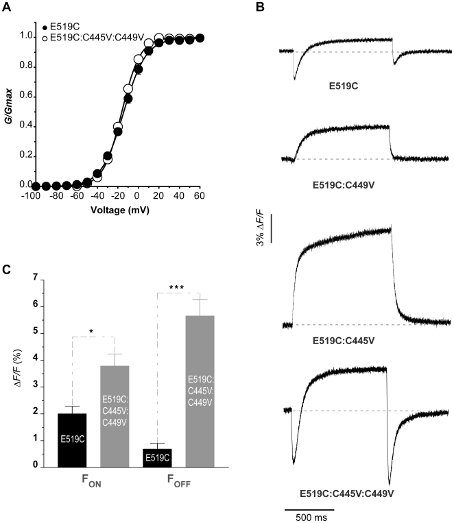 Figure 3. The fluorescence report from E519C is affected by the presence of endogenous cysteine residues.(A) Comparison of E519C (filled circles) and E519C:C445V:C449V (open circles) G-V curves. (E519C V½ = −15.2±1.6 mV and k = 10.6±0.5, n = 8; E519C:C445V:C449V V½ = −18.3±1.2 mV and k = 8.8±0.2, n = 7). In both cases, channels are labelled with TMRM. (B) Representative fluorescence profiles obtained with a depolarizing pulse to +40 mV for 1 s, from a holding potential of −80 mV and returning to −110 mV, comparing the fluorescence signal previously reported for E519C with signals obtained when one or both native cysteines are removed. (C) Graph showing mean fluorescence amplitudes of the initial quenching of E519C (n = 5), and E519C:C445V:C449V (n = 16), and the quenching upon repolarization (* = p<0.05; *** = p<0.0005). “FON” and “FOFF” represent the amplitude of the fluorescence quenching upon depolarization and repolarization, respectively. Data from the two constructs were obtained from the same oocyte batches and recorded the same day.