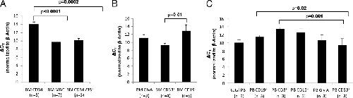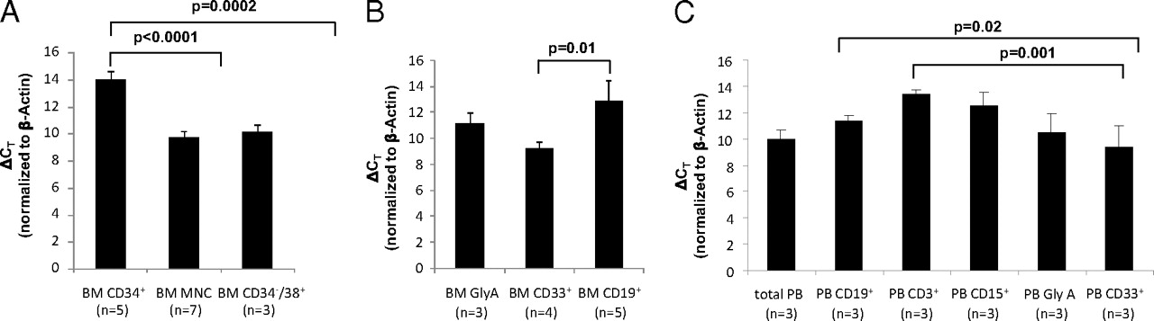 Fig. 1. (A) Expression of VENTX in total BM vs. CD34+ BM progenitors and CD34â/38+ BM cells and in (B) GlyA+ erythroid, CD33+ myeloid, and CD19+ lymphoid cells (C). VENTX expression in hematopoietic subpopulations derived from the peripheral blood. Expression analyses were performed by TaqMan qRTâPCR, and δCT values were obtained by normalization to β-actin. Bars represent average expression ±SD; the number of the tested samples is indicated. Note that all δCT values are inversely correlated to the expression level.