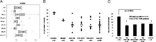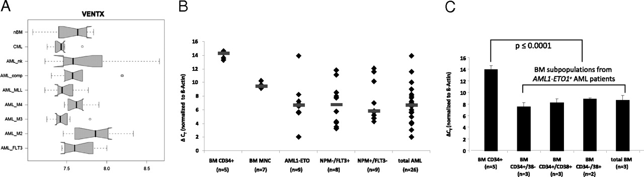 Fig. 2. VENTX expression in AML cell lines and primary AML samples. (A) Box plots of mRNA expression levels (microarray signal intensity values) of VENTX in normal bone marrow (nBM) (n = 6), chronic myelocytic leukemia (CML) and AML (10 cases each) with normal karyotype (AML_nk), AML with complex karyotype (AML_comp), AML with mixed lineage leukemia (MLL) rearrangement (AML_MLL), AML with CBFB/MYH11 fusion (AML_M4), AML-M3 with PML/RARA fusion (AML_M3), AML with AML1/ETO fusion (AML_M2), and AML with normal karyotype and FLT3 length mutation (AML_FLT3). The normalized and variance stabilized expression values are shown on a logarithmic scale (log 2). Solid bar represents median, boxes represent the 25â75% quantile range (inter-quantile range, IQR), whiskers represent the 1.5-fold IQR, small circles represent outliers. Ten samples are included in each group. (B) Quantitative expression level of VENTX in AML patients with either AML1-ETO translocation or normal karyotype and NPMc+/FLT3-LMâ or NPMcâ/FLT3-LM+. Diamonds indicate single patients; bars indicate median expression level. (C) Quantitative VENTX expression in human normal CD34+ enriched BM and sorted BM subpopulations of AML1-ETO positive AML patients. Expression analyses were performed by TaqMan qRTâPCR, and δCT values were obtained by normalization to β-actin. Note that all δCT values are inversely correlated to the expression level.