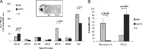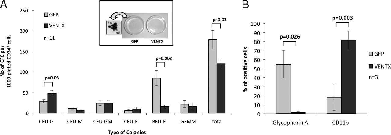 Fig. 3. (A) Morphology of colonies and colony numbers derived from CB cells transduced with VENTX compared with the GFP control. Bars represent the average colony number of 11 independent experiments ±SEM. A macroscopic picture of primary colonies and magnification of one representative GFP+ colony are shown. (B) Immunophenotypic analysis of primary colonies by glycophorin A and CD11b staining. Bars represent the average percentage of positively stained cells ±SD.