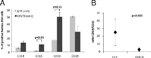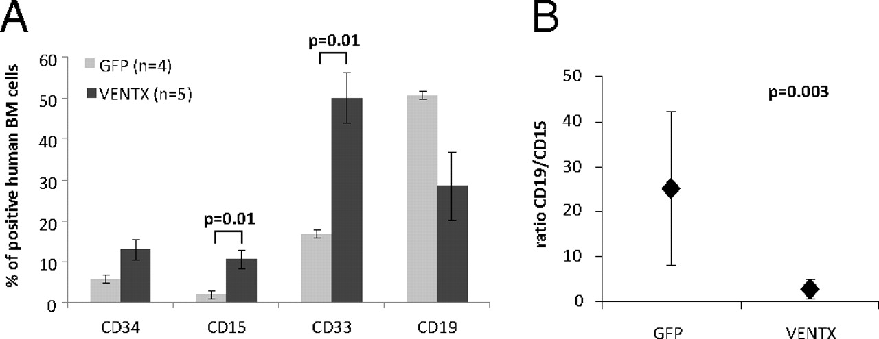 Fig. 4. Overexpression of VENTX in human CB cells increases myeloid engraftment in mice. (A) Immunophenotypic analysis of human CB cells 9–12 wk after transplantation in NOD/SCID mice transduced with either GFP or VENTX. Bars represent the average percentage of cells positive for the respective marker ±SEM. (B) Lymphoid/ myeloid (CD19/CD15) ratio of the same mice. Whiskers indicate SD.