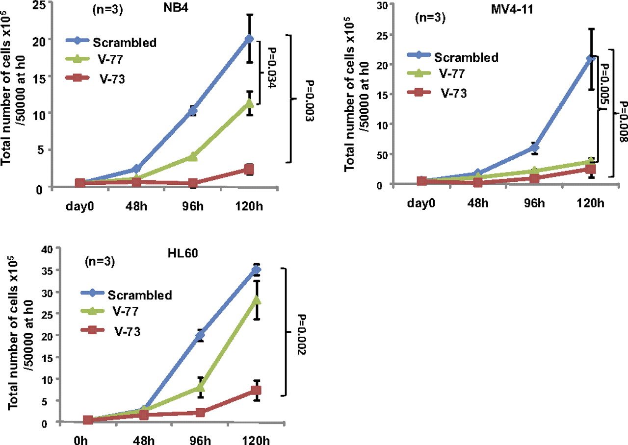 Fig. 5. Proliferation of AML cell lines after shRNA-mediated silencing of VENTX expression. Down-regulation of VENTX expression by shRNA V73 and V77-inhibited proliferation of the VENTX-expressing AML cell lines MV4-11, NB4, and HL60. In contrast, treatment with scrambled shRNA had no inhibitory effect (control). Values are represented as ±SD.