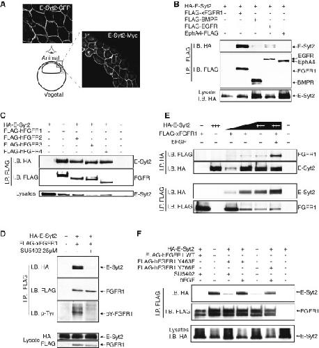 Figure 2. E-Syt2 Is a Membrane Protein that Specifically Interacts with the Activated FGF Receptor(A) E-Syt2-GFP and E-Syt2-Myc fusions were expressed in Xenopus embryos and visualized at blastula either by direct (-GFP) or indirect (-Myc) confocal epifluorescence microscopy.(B) E-Syt2 interacts selectively with FGFR1. HA-tagged E-Syt2 (HA-E-Syt2) was coexpressed with FLAG-tagged Xenopus FGFR1 (xFLAG-FGFR1), Xenopus BMPR (FLAG-BMPR), human EGFR (FLAG-EGFR), or Xenopus Epp (EphA4) (Epp-FLAG) (Winning et al., 1996) in HEK293T cells and anti-FLAG-coimmunoprecipitated (I.P.) complexes were immunoblotted (I.B.).(C) HA-tagged E-Syt2 (HA-E-Syt2) was also coexpressed with the FLAG-tagged human FGF receptors 1 to 4 (FLAG-hFGFR1, 2, etc) and analyzed for coimmunoprecipitation as in (B).(D) E-Syt2 interacts selectively with the activated, tyrosine phosphorylated form of FGFR1. HA-E-Syt2 and FLAG-xFGFR1 were coexpressed in HEK293T cells, FGFR1 inactivated or not with the specific inhibitor SU5402 and proteins immunoprecipitated and blotted as in (B).(E) bFGF enhances the E-Syt2 interaction with FGFR1. FLAG-xFGFR1 and increasing levels of HA-E-Syt2 were coexpressed as in (B) and where indicated cells were treated with bFGF. Extracts were then immunoprecipitated with either anti-HA or anti-FLAG antibodies and blotted as indicated. â+++â indicates highest level of E-Syt2 transfection.(F) The E-Syt2/FGFR1 interaction is independent of the recruitment of downstream factors to the receptor. FLAG-hFGFR1 and the point mutants Y463F and Y766F were coexpressed with HA-E-Syt2, cells treated either with SU5402 or with bFGF as in (D) and (E), and anti-FLAG-coimmunoprecipitated (I.P.) complexes immunoblotted (I.B.).See also Figure S2.