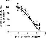 Figure 2. Fluorescence competition with 1-aminoanthracene. Titration of the HSAF/1-AMA combination with either 1 (filled symbols) or propofol (open symbols) produced inhibition of fluorescence consistent with competition for binding. Lines represent nonlinear least-squares fits to variable slope Hill functions. Values are given in Table 2.
