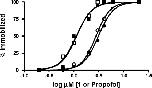 Figure 4. In vivo dose/response relationships. Tadpoles were evaluated with two end points: spontaneous (left set of curves, squares) and elicited (right set of curves, circles) movement. Filled symbols represent 1, and open symbols are propofol data. No significant differences between the two drugs could be detected for either end point.