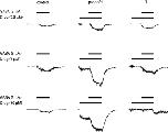 Figure 5. Electrophysiology in GABAA receptors. Excised patches containing α1β2γ2L receptors were exposed to 3 μM GABA alone (left column) or together with propofol (middle column) or 1 (right column) for 500 ms. At 0.3 and 3 μM, both compounds enhanced responses to GABA. At a high concentration (30 μM), propofol directly activated channels, whereas 1 blocked channels.