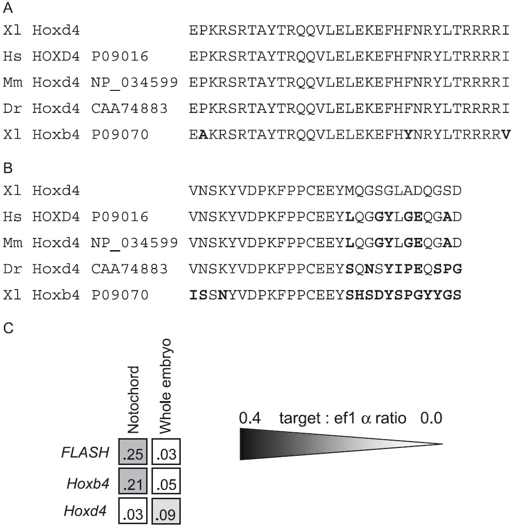 Fig. 4. Hoxd4 is not expressed in the tailbud stage notochord. (A, B) Sequence comparisons of Xenopus HOXD4 and HOXB4 proteins compared to those from