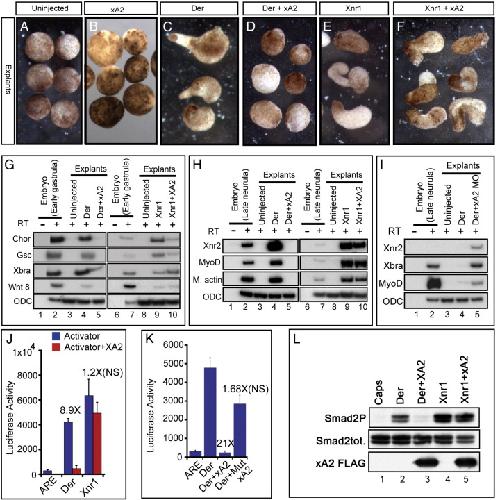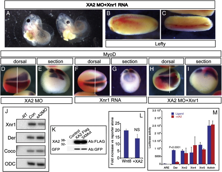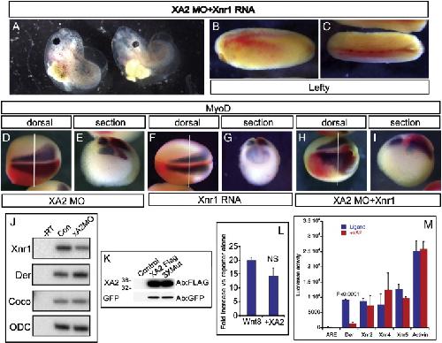Supplementary Figure 3. A. xA2 MO coinjected with Xnr1 RNA (1 pg) in left PM. B., C. Xnr1 RNA does not rescue expression of Lefty in the left LPM of xA2-depleted embryos. Double in situ hybridization for Lefty (purple) and injected LacZ RNA (red). Lefty is absent in the left LPM but increased in the midline. B is a left lateral view, C is a dorsal view. Anterior is to the left. D-I. Xnr1 RNA and xA2 MO synergize to increase MyoD expression at stage 18. Double In situ hybridization for MyoD (purple) and LacZ (red) as tracer. D., F., H are dorsal views, anterior to the left. E, G, I are posterior fragments of the same embryos sectioned transversally. xA2 MO alone increased MyoD expression on the injected side stained with Fast Red in addition to the markers stain (n = 25, D, E). Xnr1 RNA alone (1 pg) had no effect (n = 32, F, G), while the combination of RNA and MO significantly increased the lateral expansion of MyoD (n = 29, H, I) and produced a blastopore closure defect (H, right side). Bars in D, F, H indicate the plane of the transversal section. J. Depletion of xA2 protein reduces expression of Xnr1 in posterior mesoderm. RT-PCR for the indicated genes in dorsal posterior fragments of stage 18 embryos. 10 ng xA2MO were injected at the 4 cell stage and targeted at the paraxial mesoderm. K. Expression of the triple mutant xA2 and wild-type tagged xA2 proteins were equal. Embryos (stage 24) were injected with 4 ng RNA and collected at stage 10. L. xA2 does not inhibit the Wnt pathway. Embryos were injected with Siamois reporter gene and Wnt8 RNA (50 pg)+/- xA2 RNA (2ng). Statistical significance was calculated with Studentâs t test. M. xA2 is an inhibitor specific for Derrière. The ARE reporter gene (100 pg) was activated by coinjected derrière (100 pg), Xnr2 (5 pg), Xnr4 (50 pg), Xnr5 (0.1 pg), or Activin (100pg) RNA, with or without xA2 RNA (2 ng) at the 4 cell stage and measured at stage 10.5. xA2 overexpression had a significant effect only on Derrière activity (Studentâs t test). |