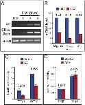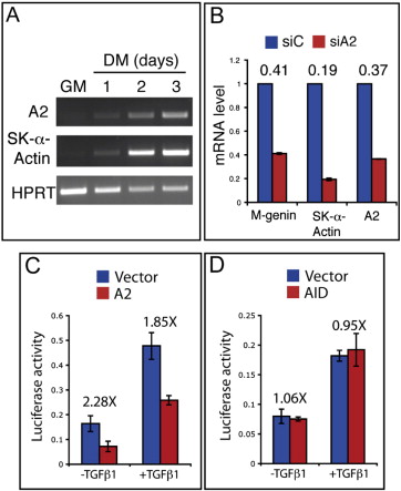 Fig. 5. mAPOBEC2 inhibits TGFβ signaling in C2C12 myoblasts. (A) RT-PCR analysis of mA2 and the muscle differentiation marker Skeletal-α-Actin mRNA levels during C2C12 differentiation. (B) Real-time qPCR analysis of the mRNA levels of A2 and the indicated muscle markers in C2C12 cells transfected either with control (siC) or anti-A2 (siA2) siRNAs and differentiated for 2 days in DM. Numbers above the histogram bars indicate the relative decrease in mRNA levels. (C, D) A2, but not AID, inhibits TGFβ signaling in C2C12 cells. Cells were transfected with the p3TP-lux reporter in combination with an empty vector (Vector) or an A2 (C) or AID (D) expressing vector. After transfection, cells were cultured with or without 5 ng/ml recombinant TGF-β1 for 24 h before harvesting for luciferase assay. Numbers above the histogram bars indicate the fold reduction in luciferase activity. |