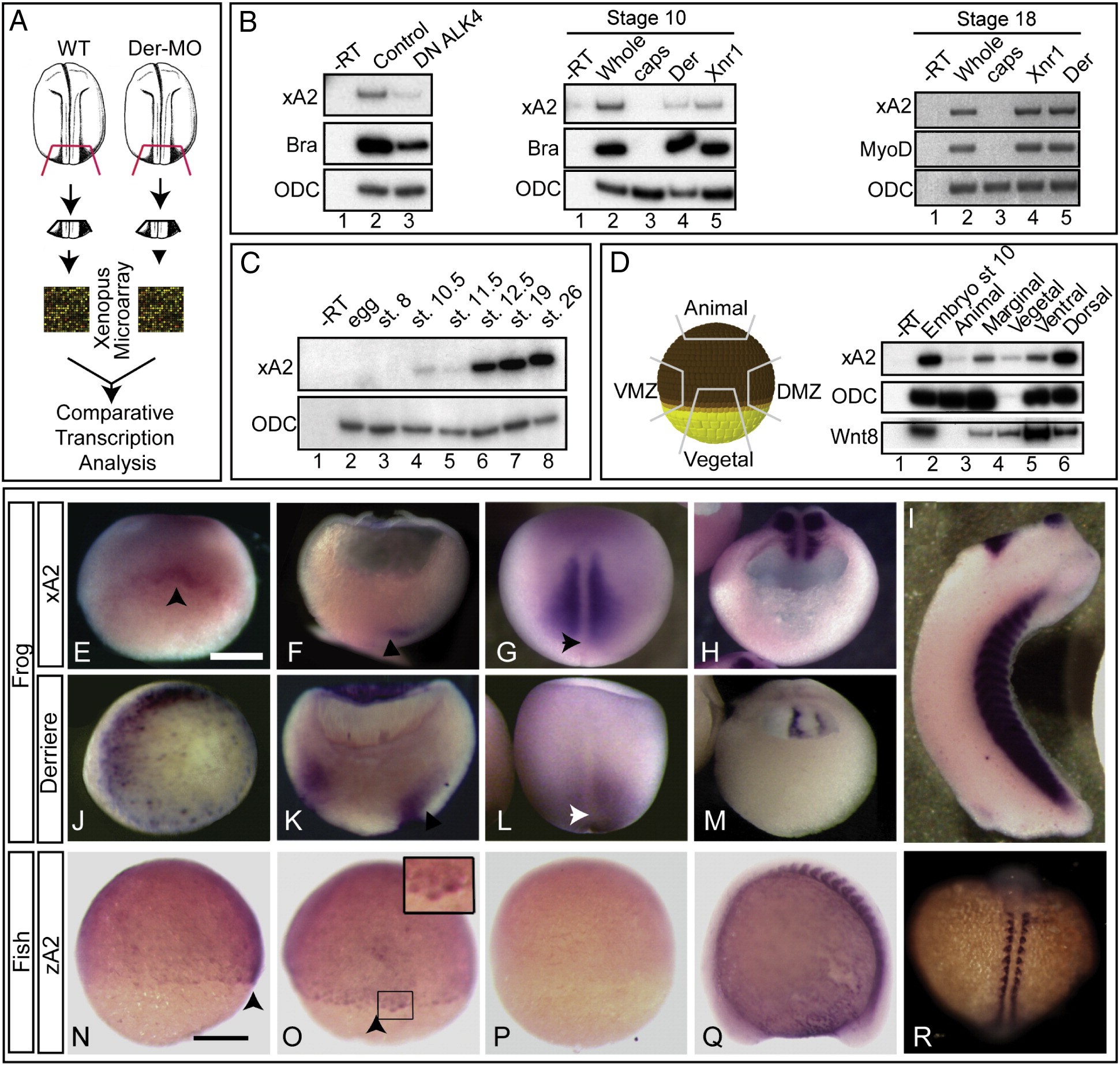 Fig. 1. APOBEC2 is a target of TGFβ signaling coexpressed with derrière in Xenopus embryos. (A) Strategy for identification of genes regulated by derrière. Posterior dorsal fragments from wild-type and derrière -MO (Der-MO)-injected embryos were isolated at stage 18. (B) TGFβ signaling and xA2 expression. Overexpression of a dominant negative type 1 receptor (DN ALK4) reduces expression of marginal xA2 in stage 10 whole embryos (left panel). Overexpressed Xnr1 (30 pg) and derrière (100 pg) RNA induce xA2 expression in stage 10 (central panel) and 18 (right side panel) animal caps. RT-PCR for xA2, MyoD, and Brachyury as markers of mesoderm induction, and ODC as loading control. (C) Timing of xA2 expression. RT-PCR of embryos collected at the indicated developmental stages. (D) Spatial expression of xA2 in stage 10 embryos. RT-PCR of embryonic explants (VMZ: ventral marginal zone; DMZ: dorsal marginal zone). (EâM) Comparative expression of xA2 and derrière. In situ hybridization for xA2 (EâI) and derrière (JâM) expression. (E, J) Stage 10 vegetalâdorsal views, arrowhead indicates the forming dorsal lip; (F, K) stage 11 dorso-ventral sections (dorsal to the right). Arrowheads indicate recently involuted mesoderm; (G, L) dorsal views (anterior up). Arrowheads indicate the blastopore; (H, M) stage 16 transversal sections, posterior fragments (dorsal is up). (I) Stage 32 lateral view. Overlap between xA2 and derrière occurs at stage 10 (dorsal marginal), stage 11 (involuted mesoderm), and stage 16 (paraxial mesoderm). (NâR) Expression of zebrafish A2 (zA2). (N, O, P) Seventy-five percent epiboly, in (N) lateral view (dorsal to the right) and (O) dorsal views. The arrowheads in panels N and O indicate the shield. (QâR) Fourteen somite stage embryo. The inset in panel O (twofold magnification) shows shield cells with nuclear stain. (Q) Lateral view, anterior to the left, (R) dorsal view (anterior up). (P) Embryo stained with the sense probe as negative control. The scale bars in panel E indicates 0.3 mm, and in panel N, 0.1 mm. |