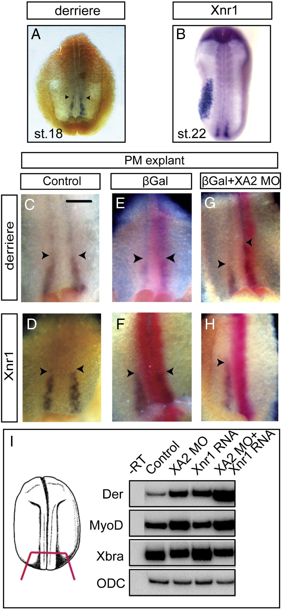 Fig. 3. xA2 depletion inhibits Xnr1 and increases derrière expression in posterior mesoderm. (AâH) In situ hybridization for derrière (stage 18, A) and Xnr1 (stage 22, B), and double in situ hybridization for derrière (C, E, G), or Xnr1 (D, F, H), purple, and LacZ RNA co-injected as tracer (red). Panels CâH are internal views of posterior dorsal fragments, anterior side up, of stage 18 embryos. The left side of each panel is the right side of each embryo. Xnr1 expression was inhibited by xA2 MO (n = 36; H). Expression of derrière was expanded in anterior direction on the side injected with xA2 MO (n = 33, arrowheads in G). The scale bar in panel C represents 0.1 mm. (I) xA2 depletion synergizes with low levels of overexpressed Xnr1 RNA. RT-PCR of posterior poles injected bilaterally with xA2 MO (10 ng), Xnr1 RNA (1 pg), or both. The combination increased derrière and MyoD, but not Xbra expression. |