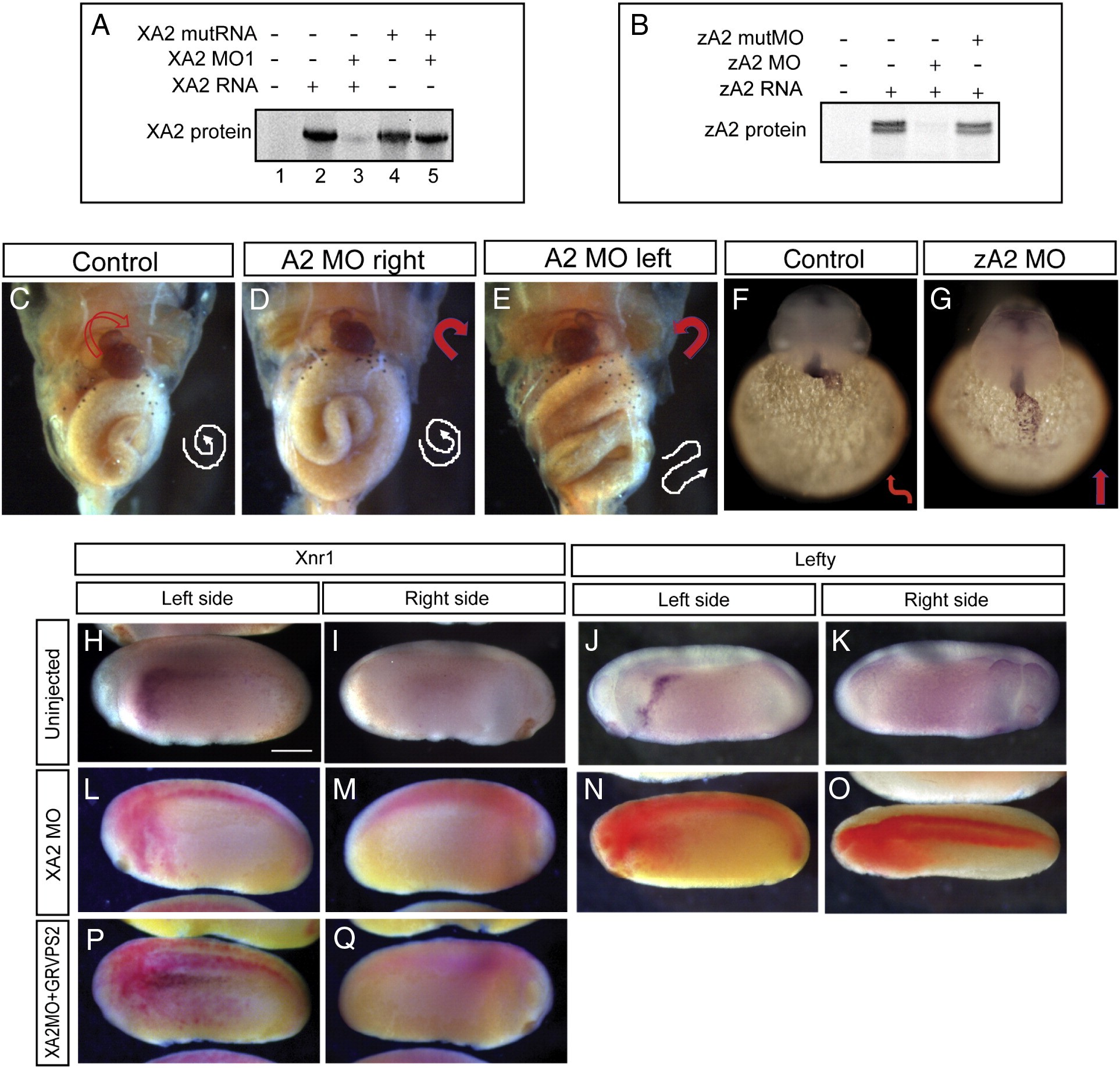 Fig. 2. Effect of APOBEC2 protein depletion in Xenopus and zebrafish. (A, B) Inhibition of in vitro translation by xA2 MO (A) and zA2 MO (B). (CâE) Left-side depletion of xA2 protein randomizes the leftâright axis in Xenopus. Embryos injected on the left side with 10 ng xA2 MO were stained for light meromyosin at stage 46. (C) Control embryo; (D) right-side MO injection normal embryo; (E) left-side MO injection, inverted heart and abnormally folded intestine. Arrows indicate the direction of the heart outflow tract and intestinal looping. (FâG) Depletion of zA2 protein prevents heart looping in zebrafish. In situ hybridization with cmlc2 antisense probe for heart muscle on 36â40 hpf embryos. Arrows indicate ventricular looping. (HâQ) xA2 depletion blocks the left-side nodal signal. In situ hybridization for Xnr1 (H, I, L, M, P, Q), and Lefty (J, K, N, O) in purple, and injected LacZ RNA as tracer (LâQ) in red. Wild-type expression of Xnr1 (H) and Lefty (J) in the left lateral plate mesoderm was inhibited by injection of xA2 MO in the left paraxial mesoderm (L, N). Left-side expression of Xnr1 was rescued by coinjection of GRVP16SMAD2δ3 RNA (25 pg RNA, induced at stage 16; P). All views are lateral, except in panel O (dorsal), anterior to the left. Embryos are stage 23 (Xnr1) and stage 24 (Lefty). The scale bar in panel H represents 0.3 mm. |