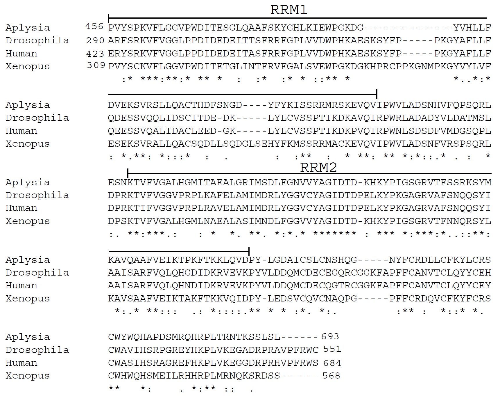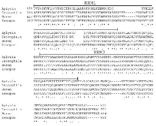 Alignment of the C-terminal domain of the Aplysia CPEB (Aplysia), DrosophilaCG5735RA (Drosophila), Human KIAA0940 (Human) and Xenopus laveisoocyte CPEB ( Xenopus). Two RNA binding motifs are marked as RRM1 and RRM2. The program ClustalV is used for alignment.
