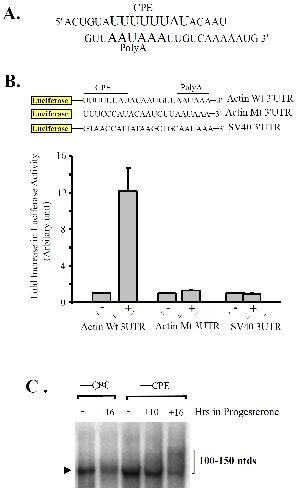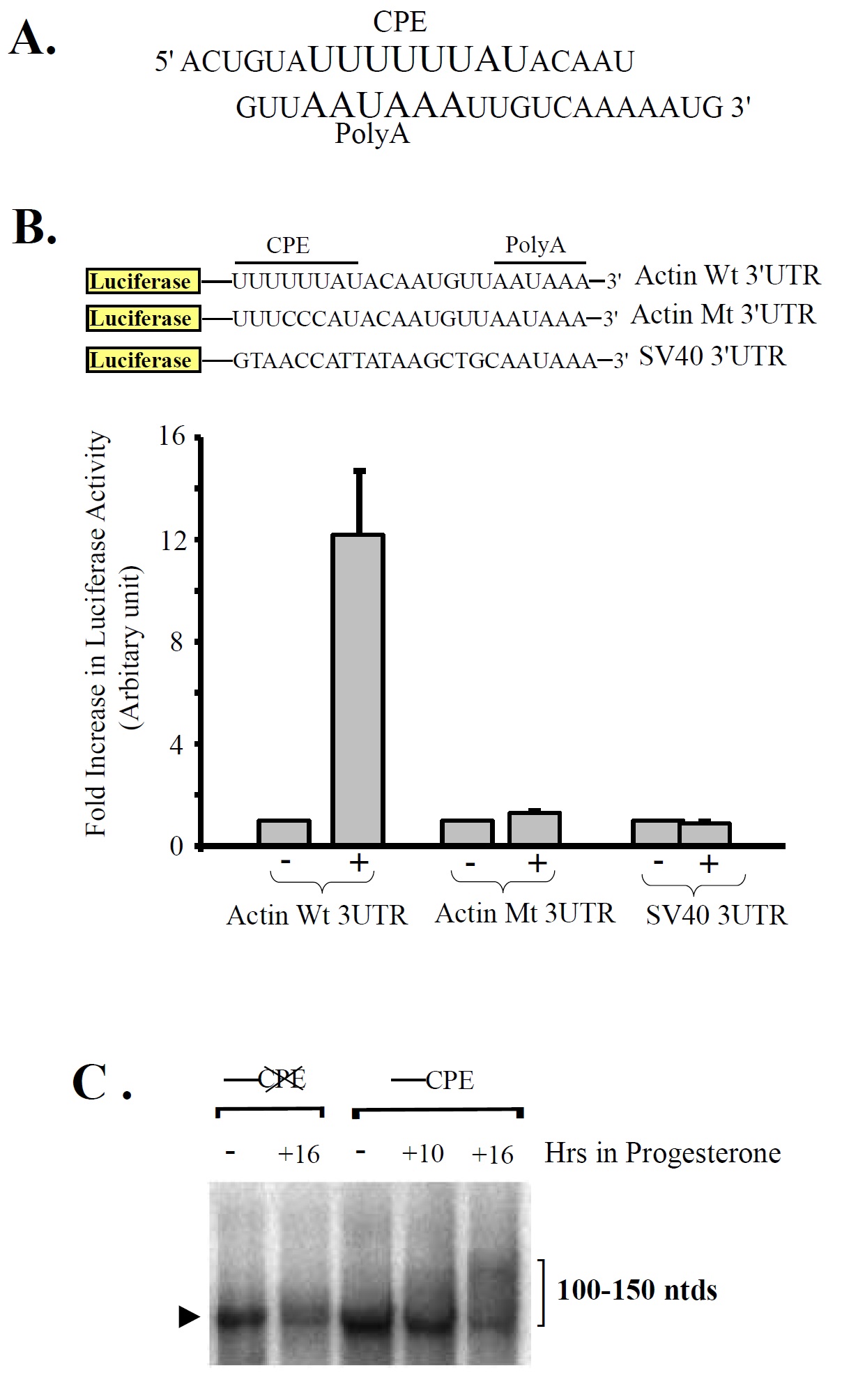 (A) The cytoplasmic polyadenylation element (CPE) UUUUUUAU and hexanucleotide Poly A signal AAUAAA is underlined in the 3′ UTR of Aplysia neuronal actin mRNA.