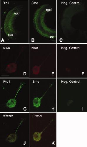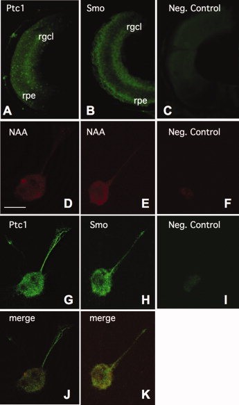 Figure 2. XPtc1 and XSmo co-receptor expression in RGCs. Ptc1 and Smo expression is observed in the RGC layer and the retinal pigment epithelium (RPE) of sectioned retinas from stage 39 embryos (A, B, respectively) as compared to a negative control (C). D, E: Individual cultured RGCs are identified by neurofilament associated antigen (NAA) immunoreactivity. These retinal cells are also shown to express both Ptc1 (G) and Smo (H). F, I: No appreciable staining is detected in negative controls. rgcl: retinal ganglion cell layer; rpe, retinal pigment epithelium. Scale bar in D = 10 μm.