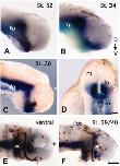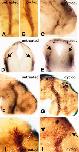 Figure 1. Xshh expression in the developing brain. AâC: Lateral views of Xshh mRNA expression (blue) in stage 32, 34, and 38 embryonic brains, respectively. D:Xshh is found at the level of the midbrain in a transverse section of a stage 38 Xenopus embryo. Dotted red line denotes the presumptive location of the optic tract. E: A ventral view of HRP-labeled retinal axons (brown), along with Xshh expression (blue) in a stage 38 brain, at the optic chiasm. F: A lateral view of the same co-labeled brain, along the optic tract, with the white arrow at RGC axons, midway across the diencephalon. Unless otherwise noted, in all appropriate figures, dorsal is to the top. fp, floor plate; no, notochord; nt, neural tube; oc, optic chiasm; ot, optic tectum. Scale bar in D = 100 μm, and in F = 40 μm.
