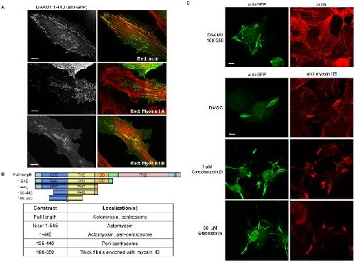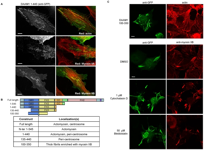 Figure 2. N-terminal regions of DAAM1 are involved with actin stress fibers and centrosome targeting.(A) GFP-Flag-DAAM1 (1–440) was expressed in HeLa and analyzed by confocal imaging. DAAM1 was immuno-localized with anti-GFP (in green). Cells were counter-stained with TRITC-phalloidin, anti-myosin IIA or anti-myosin IIB (red). (B) Table summarizing the localization of various DAAM1 constructs tested in this study. (C) COS-7 cells expressing DAAM1(100–350) form large filaments enriched for myosin IIB that do not colocalize with F-actin. Treatment with various acto-myosin disrupting drugs with the indicated concentration for 45 min do not abolish the presence of these fibrils. Bars = 10 µm.