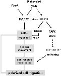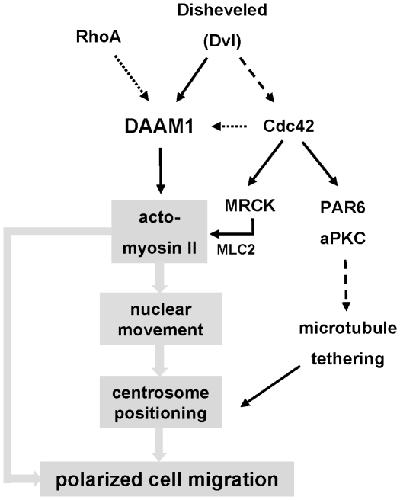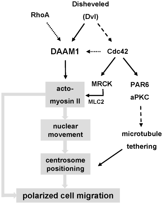 Figure 7. A model of DAAM1 involvement in directed cell migration.Through its effects on F-actin assembly and the propensity to associate with myosin IIB, DAAM1 can directly affect the regulation of the acto-myosin network. Its upstream activator, Disheveled, is involved with activation of other polarity proteins through Cdc42 [30]. Cdc42 and MRCK are implicated in nuclear movement via effects on the sub-nuclear acto-myosin network [28], [34]. PAR3/PAR6/aPKC and dynein maintain the centrosome in the cell centroid via their effects on microtubule organization [29]. The ability of DAAM1 to interact with RhoA and Cdc42 could be a focus of cooperativity between the two GTPases in the polarity pathway. Full arrows indicate direct interaction, dashed arrows indicate indirect interaction, and dotted arrows indicate interaction yet to be established in this pathway.