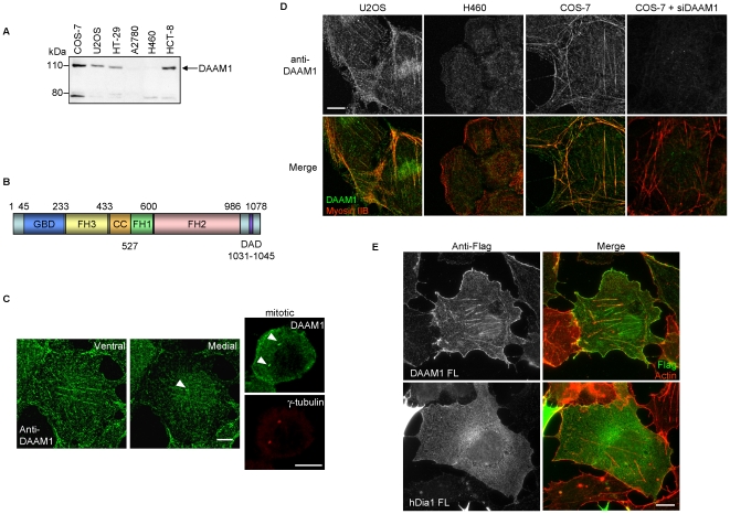 Figure 1. DAAM1 is localized to different regions in the cells.(A) Western analysis of DAAM1 expression in different cell lines. Total protein lysate (30 µg) were loaded per lane. (B) Domain organization of DAAM1. (C) Left: confocal images of COS-7 cell taken at different planes. Right: co-localization of DAAM1 with centrosomes in prophase (after centrosome duplication) marked by anti-γ-tubulin. White arrowheads indicate centrosomes. (D) Confocal images of U2OS and DAAM1-null H460 cells, as well as COS-7 and COS-7 cells with DAAM1 knockdown by siRNA (COS-7 + siDAAM1). Endogenous DAAM1 was detected by indirect immuno-fluorescence with anti-DAAM1 under identical conditions. (E) Full-length Flag-DAAM1 or Flag-hDia1 (in green) was expressed in COS-7 cells and co-stained for actin (red). Bars = 10 µm.