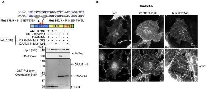Figure 3. Interaction of DAAM1 with Rho GTPases.(A) The design of putative Rho binding defective mutants was based on sequences in mDia1: RhoA complex [6]. An in-vitro pulldown assay was performed in which equal amounts of DAAM1-N wildtype (WT) or the GBD mutants were added to Sepharose beads loaded with GST or GST-RhoAV14. The proteins were transferred to PVDF and stained as shown. The membrane was subsequently probed as indicated (B) GFP-DAAM1-N WT or the GBD mutants were expressed in COS-7 cells and immuno-localized with anti-GFP and F-actin (TRITC-phalloidin); all three constructs show typical DAAM1 filamentous staining. Bars = 10 µm.
