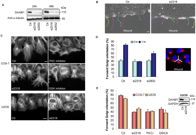 Figure 4. DAAM1 knockdown affects directed cell migration.(A) Efficacy of two different siRNA against DAAM1 in COS-7 cells by Western analysis at 24 hours and 48 hours post-transfection. (B) COS-7 cells transfected with control (Ctr) or human DAAM1 siRNA (si2318) for 48 hours were scratched and observed using time-lapse imaging for 12 hours. Tracks of individual cells are shown as colored lines. Bar = 40 µm. (C) Wound-edge COS-7 cells subjected to GSK inhibitor (SB216763, 20 µM) and PKC inhibitor (RO-320432, 20 µM), or si2318 (40 pmol) were stained with anti-α-tubulin to visualize the microtubule network. Loss of DAAM1 was associated with random protrusions versus the more organized broad extensions in controls. Wound-edge U2OS cells subjected to siRNA treatment are shown in the bottom panel. Bar = 10 µm. (D) Forward Golgi orientation of COS-7 cells transfected with control (Ctr) or DAAM1 siRNA (si2318 or si2832, 40 pmol) at 0 and 1 hour post-wounding. Cells were scored for Golgi re-orientation using a 120° sector centered on the nucleus as shown on the right. (E) Right: Western analysis of DAAM1 knockdown in U2OS cells. Left: Golgi re-orientation in COS-7 and U2OS cells treated with various inhibitors 1 hour before wounding. PKC inhibitor (PKCi) and GSK inhibitors (GSKi) were used as in (c). In these analyses, cells were scored for Golgi re-orientation in three separate experiments. Error bars indicate standard deviation from the mean.
