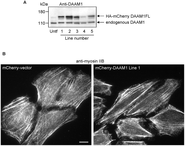Figure 5. Stable expression of DAAM1 in U2OS cells.(A) Levels of mCherry-DAAM1 and endogenous DAAM1 in the five stable U2OS lines as determined by western analysis with anti-DAAM1. (B) Typical myosin IIB staining of the ventral membrane region for the control and mCherry-DAAM1 expressing cells. Bars = 10 µm.