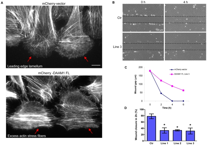 Figure 6. Effects of stable DAAM1 expression in U2OS cells.(A) Cells stably expressing mCherry alone or mCherry-DAAM1 as shown in Fig. 5 were subjected to wound healing assays and stained with Alexa Fluor 633-phalloidin to visualize the actin fibers. Red arrows indicate the different arrangement of actin fibers at the leading edges of vector control and DAAM1-expressing cells. Red arrows indicate the lamella region largely devoid of stress fibers in controls (top panel red arrows), and the presence of prominent actin fibers instead for the DAAM1-expressing cells (lower panel). (B) Cell lines stably expressing the mCherry vector or mCherry-DAAM1 were subjected to scratch wounding (wound indicated by dotted lines) and images were acquired at 2 hour intervals over 6 hours using an Olympus IX71 microscope equipped with a 10x/0.25 Plan-APOCHROMAT lens. Images at 0 and 4 hour time points are shown here for control and the DAAM1 cell-line 3. (C) Line graph showing the reduction in wound gap over the entire course of 6 hours for the control line and DAAM1-expressing line 3. (D) Percentage of wound gap covered 2 hours after scratch is plotted for control versus three of the lines. Error bars indicate standard error of the mean (SEM) from 3 independent experiments. Asterisks indicate that difference in the measurement between the control and each DAAM1 expressing line is statistically significant with a p-value less than 0.05 (t-test). Bars = 10 µm (unless specified).
