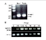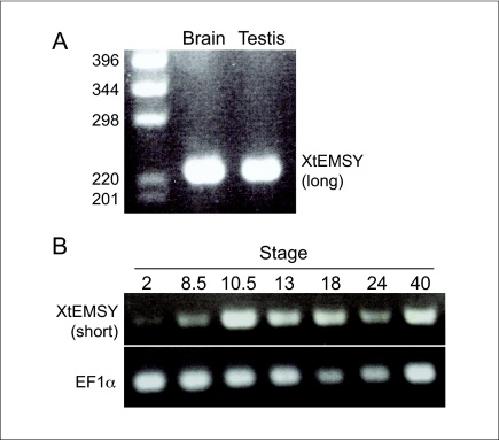 Figure 2. Expression of XtEMSY during development. RT-PCR confirms that the long form of XtEMSY is expressed in adult brain and testis (a), and that the short form is expressed at the 2-cell stage and at embryonic stages 8.5, 10.5, 13, 18, 24 and 40 (b). Primers specific for EF1α were used as a control.