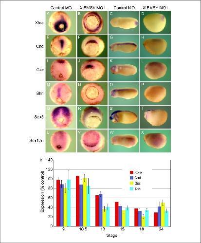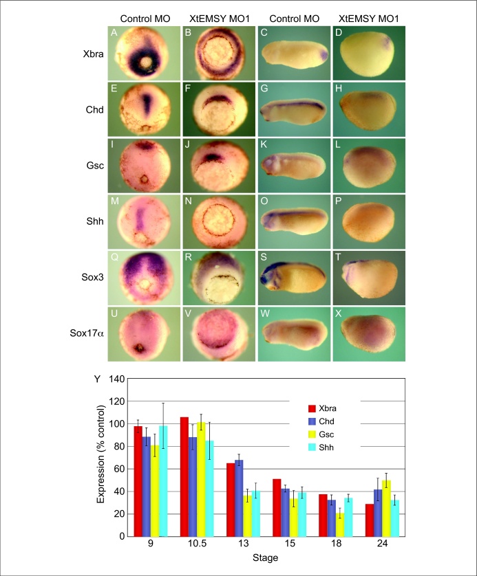 Figure 5. Expression of various regional markers is down regulated in embryos injected with XtEMSY MO1. (a–x) The expression patterns of the indicated genes at gastrula and tailbud stages in control embryos and embryos injected with XtEMSY MO1. Note the impairment of gastrulation and the downregulation of, particularly, Shh (m–p). The spatial expression patterns of the analysed genes are only slightly affected. (y) Real-time RT-PCR shows that expression of Xbra and Chd is slightly decreased by loss of XtEMSY function, while expression of Gsc and Shh is down regulated more strongly.