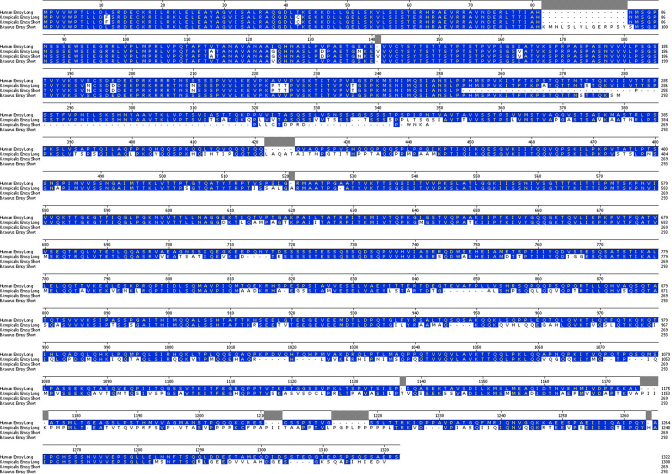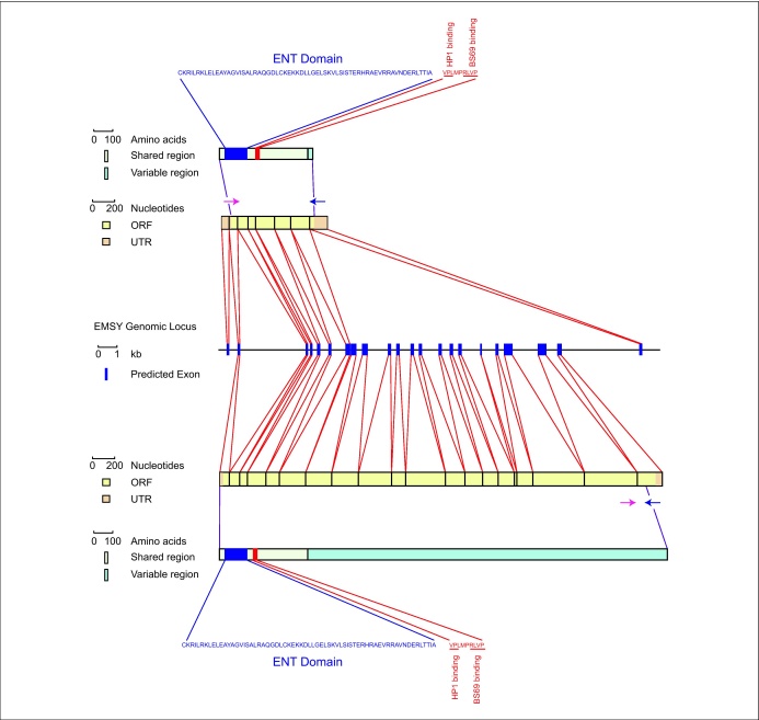 Figure 1. Genomic structure of the XtEMSY locus and of XtEMSY isoforms. The XtEMSY locus comprises 22 exons, of which the first 21 encode a protein of 1291 amino acids. A short transcript comprising exons 1â7 and exon 22, encoding a protein of 269 amino acids, was detected in early embryos of Xenopus tropicalis. ESTs representing this transcript were found in egg, gastrula and tadpole cDNA libraries: AL870737.2 (egg); AL871852.2 (egg); AL652745.2 (gastrula); and CX371164.1 (tadpole). The short and the long forms of XtEMSY both contain the ENT domain and putative HP1β and BS69 binding sites.