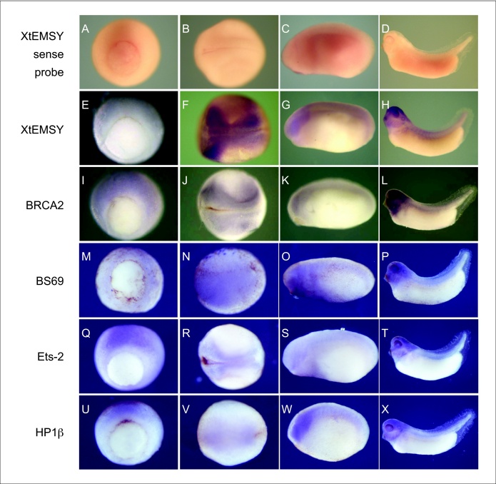 Figure 3. Analysis of the expression of XtEMSY and of some of its putative interactors. Gastrula stages are shown in panels (a, e, i, m, q, u), neurula stages in panels (b, f, j, n, r, v), tailbud stages in panels (c, g, k, o, s, w) and tadpole stages in panels (d, h, l, p, t, x). (aâd) Use of an XtEMSY sense probe shows no staining. (eâh) XtEMSY is expressed throughout the ectoderm at the gastrula stage (e) and is then expressed most strongly in the neural plate and dorsal regions at the neurula stage (f). By tailbud stages XtEMSY is expressed most strongly in the head and along the dorsal axis (g). At tadpole stage XtEMSY staining is observed in the entire head region, including the brain, eye, otic vesicle and branchial arches and along the dorsal axis in the neural tube and somites (h). The expression patterns of BRCA2 (iâl), BS69 (mâp), Ets-2 (qât) and HP1β (uâx) resemble those of XtEMSY.
