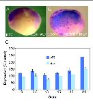 Figure 6. Loss of XtEMSY function causes upregulation of p53. (a and b)In situ hybridisation analysis at the late neurula stage reveals that p53 is upregulated in embryos injected with XtEMSY MO1 (b) compared with controls. (c) Temporal RT-PCR analysis of p53 and Bax expression in embryos injected with XtEMSY MO1. Expression levels are normalised to those of ornithine decarboxylase and levels in control MO injected embryos are defined as 100%. Note that expression of p53 is elevated between stages 18 and 24 (dark blue), while Bax is upregulated slightly later than this.