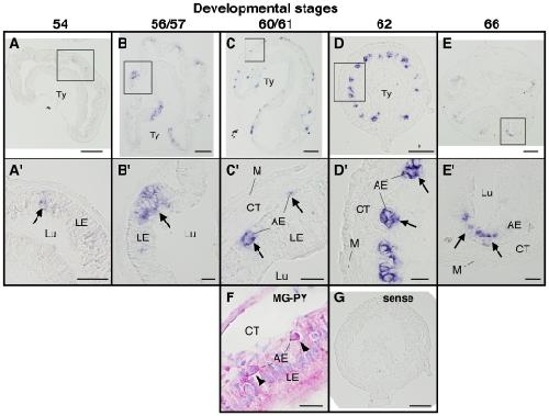 Spatio-temporal expression profile of stem cell-associated gene LGR5 in the intestine during thyroid hormone-dependent metamorphosis in Xenopus laevis.