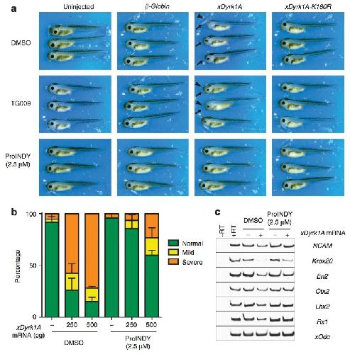 Figure 5 | Whole-embryo xDyrk1A overexpression assay. (a) In vivo rescue of xDyrk1A overexpression-induced deformity. X. laevis embryos were treated with vehicle alone, TG009 (2.5µM) or proINDY (2.5µM). The embryos were injected with 500pg of -globin, xDyrk1A or kinase-inactive xDyrk1A mRNA (xDyrk-K180R) at the eight-cell stage and incubated until they reached stage 40/41. Arrows, eye deformity; arrowheads, head deformity. (b) Rescue rate of embryo deformity. X. laevis embryos were treated with either proINDY (2.5µM) or vehicle alone and injected with 250pg or 500pg of xDyrk1A mRNA.