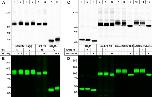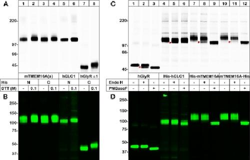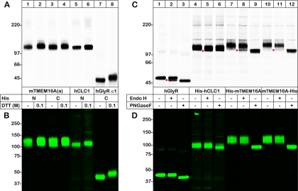 Fig. 2. Total and cell-surface expression of the Cl−-conducting channels mTMEM16A(a), hCLC-1, and hGlyR α1. A, B, The indicated [35S]-methionine- and Cy5-labeled proteins were purified by Ni-NTA chromatography and resolved with both reducing and nonreducing SDS-urea-PAGE. The incorporated [35S]-methionine (A) and Cy5 fluorescence (B) was visualized with phosphorimaging and Typhoon fluorescence scanning to display the total and cell-surface pools of the proteins, respectively. N and C in the figure legend indicate whether the His tag was N- or C-terminally positioned, respectively. C, D, Aliquots of the same protein samples used in A and B were deglycosylated with Endo H and PNGase F, as indicated, and were found to exist exclusively in the complex-glycosylated form in the plasma membrane (D). In contrast, the [35S]-methionine-labeled protein was partially Endo H-sensitive (C, red arrowheads).