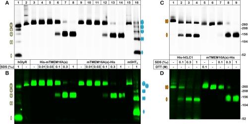 Fig. 3. BN-PAGE analysis of the oligomeric structure of mTMEM16A(a). The indicated channel proteins were purified by nondenaturing Ni-NTA chromatography from digitonin extracts of X. laevis oocytes, resolved by BN-PAGE, and visualized in the [35S]-methionine-labeled total form or the Cy5-labeled plasma membrane-bound form with phosphorimaging (upper panels) or Typhoon fluorescence scanning (lower panels), respectively. Protein migration is shown both under native conditions and after partial denaturation following a 1-h incubation with SDS and/or DTT at 37 °C, as indicated. A, B, The yellow and blue ovals schematically illustrate the oligomeric states (protomers to pentamers) of the partially denatured hGlyR α1 and m5HT3R, respectively. C, D, The orange ovals schematically illustrate the native homodimeric and the denatured protomeric states of the hCLC-1 channel; the homodimeric structure of prokaryotic CLCs was verified by x-ray crystallography (54). The number in the right margin indicates the mass of the partially disassembled hGlyR α1, which resolved in the BN-PAGE gel as a ladder of proteins consisting of one to five 52-kDa protomers (cf. Figs. 3A and 3B, lane 1).